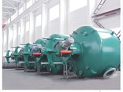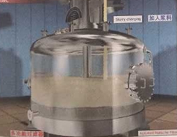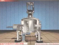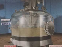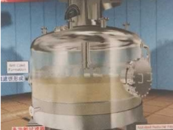 圖①:反應(yīng)釜中的混懸液靠自身的重力或經(jīng)泵注入到過(guò)濾器中,然后在濾液接收裝置中抽真空,濾液接收裝置連接在濾液流出口上。 圖②:濾液通過(guò)濾床被抽濾至接收裝置,濾餅逐漸在濾床上形成。 圖③:當(dāng)大多數(shù)濾液抽出后,濾床上沉積的濾餅可能還含有5%-20%的溶劑,具體情況與混懸液中固體的性質(zhì)有關(guān)。 圖④:首次過(guò)濾完成后,如果需要,可噴淋洗滌液,啟動(dòng)攪拌器反向攪拌,使濾餅重新混懸。 圖⑤:通過(guò)操作攪拌器,還可以輕輕地?cái)D壓濾餅,擠出殘余液體。 圖⑥:為了盡可能多地脫除濾餅中的殘留液體或溶劑,過(guò)濾器可加上夾套,在其中通蒸汽或熱水加熱干燥。在過(guò)濾器的頂部和底部同時(shí)抽真空,殘留溶劑揮發(fā),通過(guò)接收裝置上的冷凝器濃縮并回收。對(duì)有些物料,執(zhí)行上述流程即可,毋須另配干燥器進(jìn)行干燥。 圖⑦:最后,經(jīng)過(guò)攪拌器在卸料方向的旋轉(zhuǎn)和同時(shí)的下降運(yùn)動(dòng),攪拌器刮鏟一層一層地順序?qū)V餅刮出,濾餅可從卸料口自動(dòng)出料。 圖⑧:攪拌器的攪拌漿和刮鏟示意。 紐克多功能過(guò)濾器系統(tǒng)具備如下優(yōu)點(diǎn): 1、系統(tǒng)封閉:此設(shè)備是一個(gè)全封閉運(yùn)行的系統(tǒng),能完全避免生產(chǎn)過(guò)程中溶劑對(duì)空氣的污染,同時(shí)能減少因與毒性物接觸而導(dǎo)致操作人員中毒事故的發(fā)生。 2、回收完全:物料和溶劑近乎完全回收,避免因物料遺漏和溶劑揮發(fā)而引起的浪費(fèi),具有很大的經(jīng)濟(jì)效益,特別是處理物料和使用溶劑價(jià)值較高時(shí)更是如此。 3、同時(shí)干燥:過(guò)濾、清洗和干燥能在同一設(shè)備中完成。容器壁可以配備加熱套層,從而能夠進(jìn)行干燥的操作。 4、操作連續(xù):能夠使過(guò)濾和干燥在一個(gè)連續(xù)的系統(tǒng)內(nèi)進(jìn)行,毋須處理濕濾餅。在過(guò)濾器下可以連接一個(gè)干燥器,使?jié)駷V餅直接卸入干燥器,干燥后的產(chǎn)品可以機(jī)械傳送至稱量、包裝等工段。 5、節(jié)約人力:一個(gè)經(jīng)過(guò)簡(jiǎn)單培訓(xùn)的非技術(shù)人員即可以完成操作。開(kāi)、關(guān)、自動(dòng)進(jìn)料、自動(dòng)出料都毋須技術(shù)人員監(jiān)控。 6、清洗徹底:由于此設(shè)備具有自動(dòng)噴淋和重新打漿的功能,濾餅可以得到非常徹底的清洗。并且洗滌液用量較其它類型設(shè)備少,可減少排污量和降低廢水處理費(fèi)用。 7、清洗生產(chǎn):此多功能過(guò)濾器干燥系統(tǒng)裝配有粉塵捕集器,能完全收集干燥后產(chǎn)生的粉塵,可滿足高潔凈度的生產(chǎn)操作要求。 | |